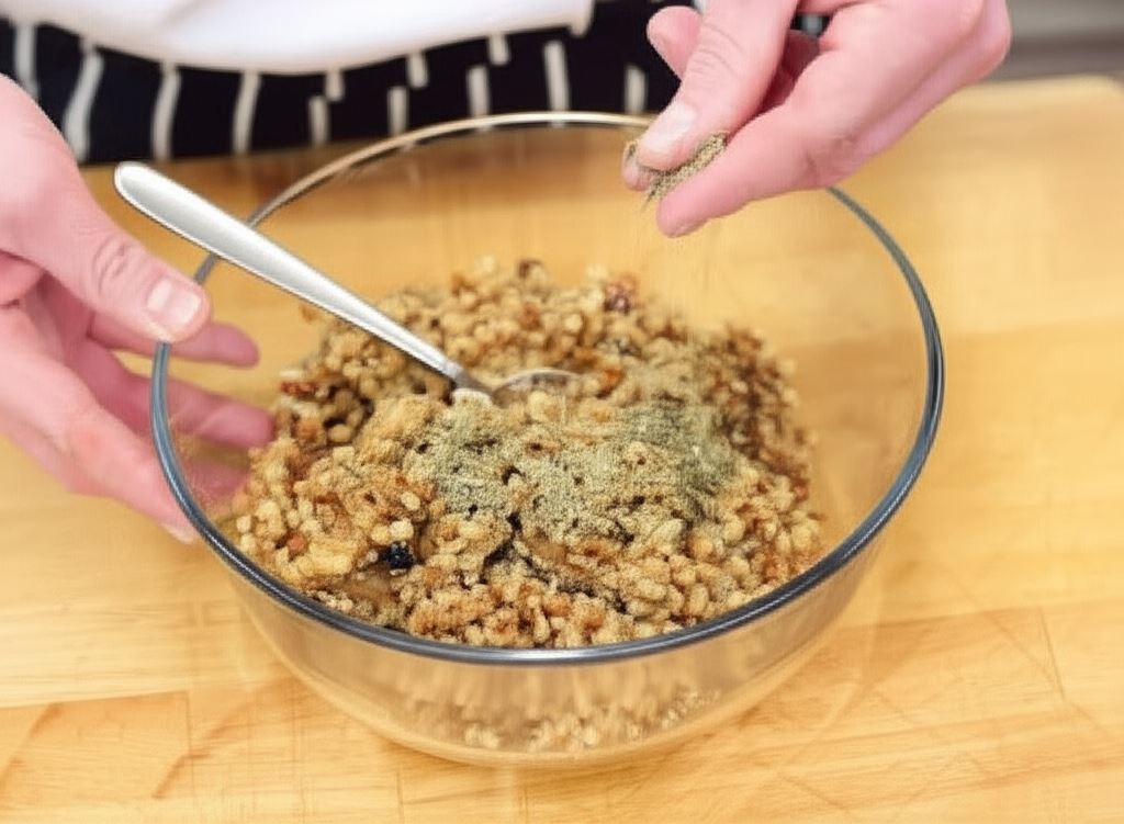 Schłodzoną kaszę przypraw do smaku majerankiem, zmiel w maszynce i połącz z surowymi jajkami.
