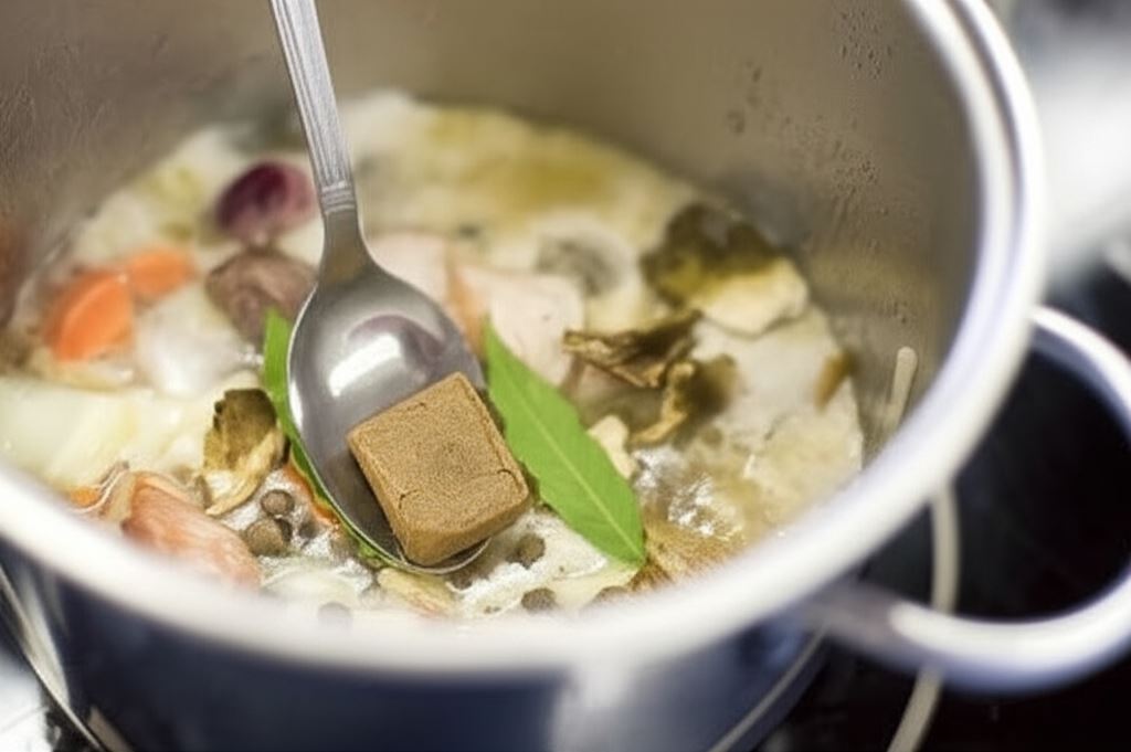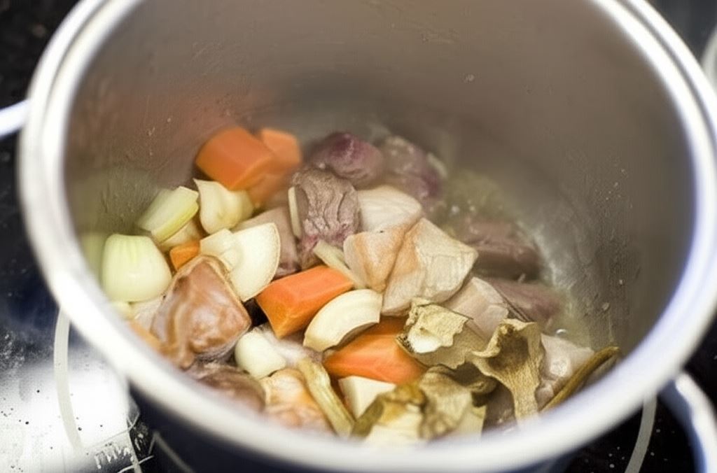 Zalej wszystko 700 mililitrami wody, wsyp kostki Knorr, dodaj grzyby i resztę przypraw – liść, ziele i pieprz. Gotuj aż mięso zmięknie. Potem wyjmij z wywaru mięso, grzyby oraz warzywa i ostudź.