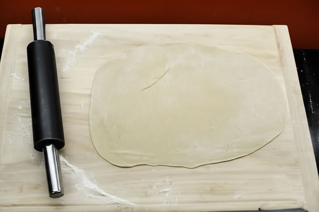 Ze mąki, wody i soli wyrób ciasto na pierogi. Rozwałkuj je cienko na blacie i wykrój kółka za pomocą szklanki.