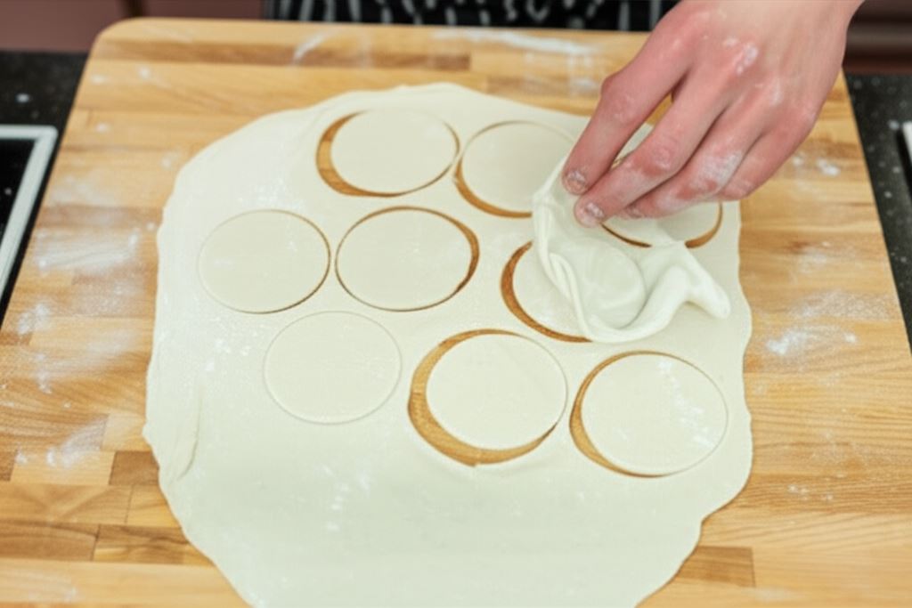 Umieść łyżką nadzienie na środku każdego krążka. Złóż na połowę i sklej krawędzie. Potem gotuj pierogi w sporej ilości wody przez 3-5 minut, dopóki nie będą miękkie. Te pierogi możesz serwować ugotowane lub usmażone.