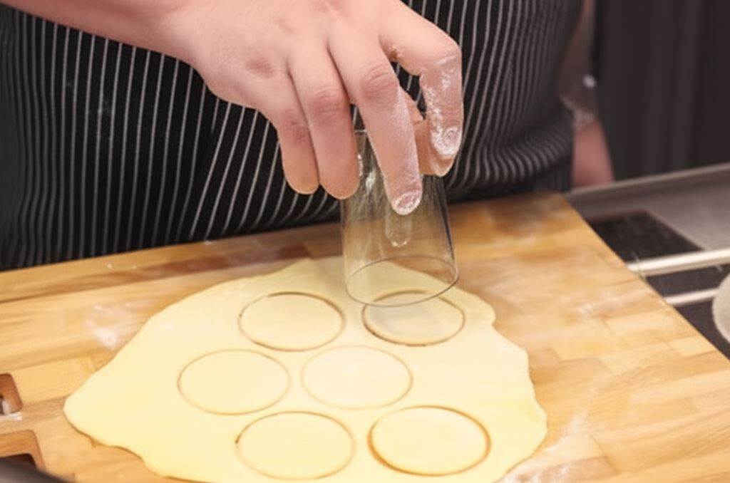 Przesiej mąkę do miski, wlej olej i zalej wrzącą wodą. Zamieszaj i dokładnie przykryj folią. Odstaw na 15 min. Po upływie tego czasu rozwałkuj i wytnij krążki średniej wielkości używając np. szklanki.