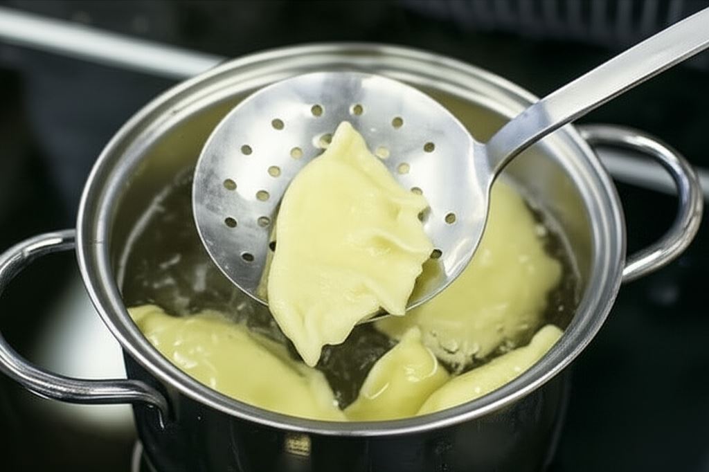 Doprowadź wodę do wrzenia w garnku, dodaj szczyptę soli i umieść pierogi we wrzątku, a kiedy wypłyną na powierzchnię ostrożnie wyciągnij je łyżką cedzakową i umieść na talerzu.