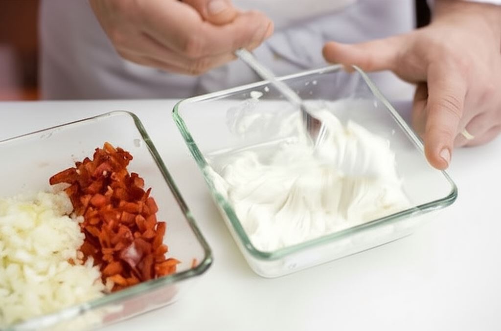 Twaróg rozdrobnij dokładnie widelcem. Cebulę i paprykę posiekaj na małą kostkę.