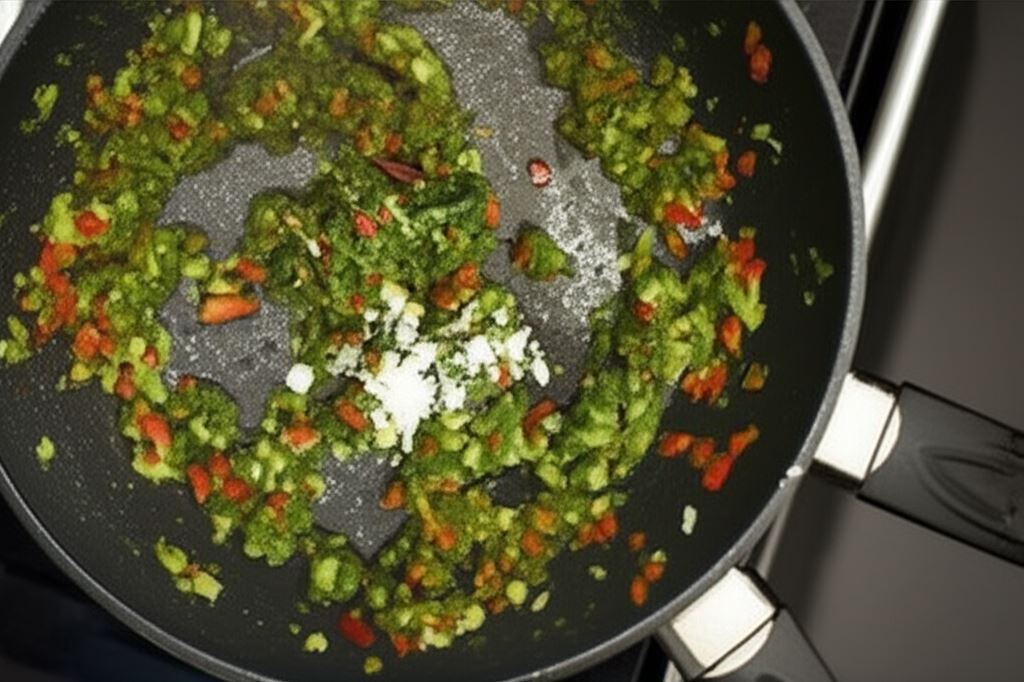 Na rozgrzanej oliwie zesmaż cebulę i paprykę. Dodaj szpinak, smaż wspólnie aż woda odparuje. Przypraw pokruszoną mini kostką Knorr i pieprzem, potem wsyp pokruszony twaróg i zamieszaj.