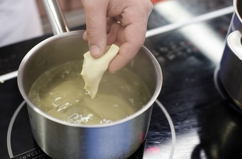 Uformowane pierogi wrzucaj do osolonego wrzątku i gotuj około 3 minut od czasu, gdy wypłyną na powierzchnię wody.