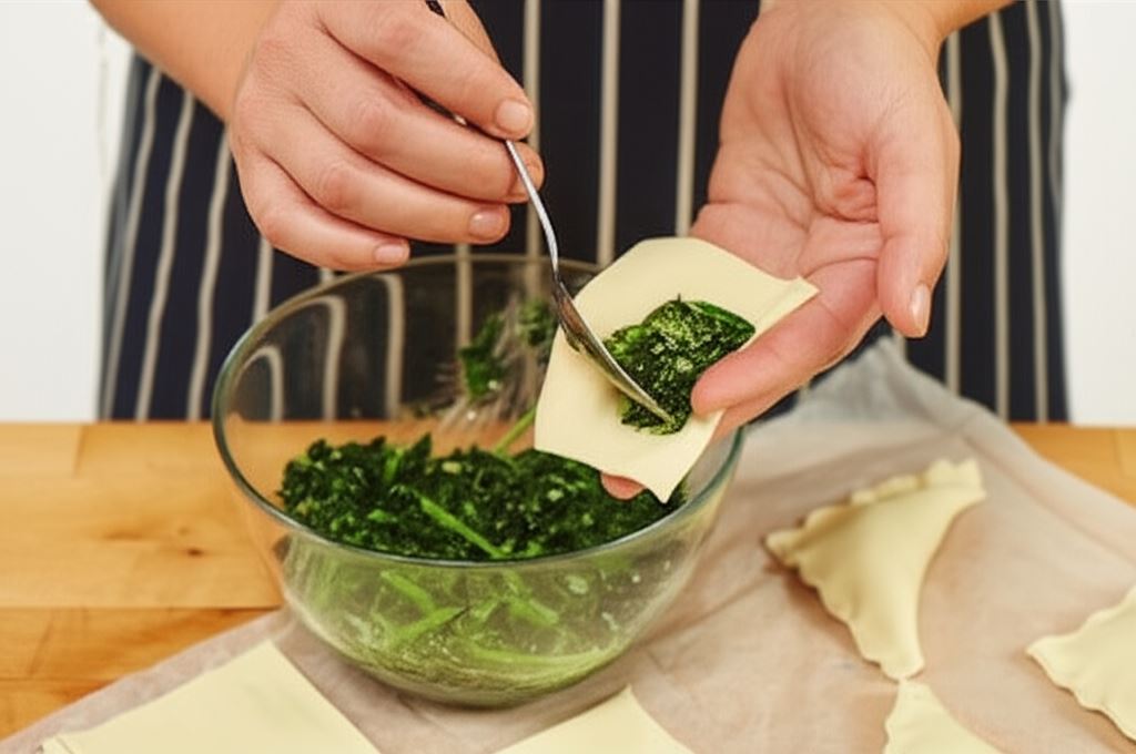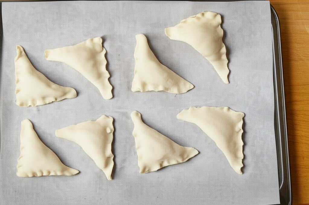 Umieść nadzienie szpinakowe i złóż w taki sposób, aby utworzyły się trójkąty. Dokładnie sklej krawędzie ciasta. Zastosuj wodę lub białko jajka, jeśli jest to niezbędne.