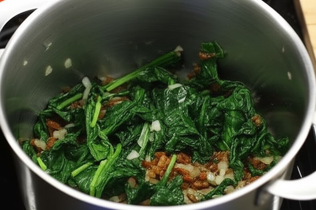 Zamrożony szpinak odmroź i wyciśnij starannie wodę. Świeży opłucz i wysusz. W garnku zrumień cebulę oraz szpinak, po czym dodaj pocięte w kostkę suszone pomidory.
