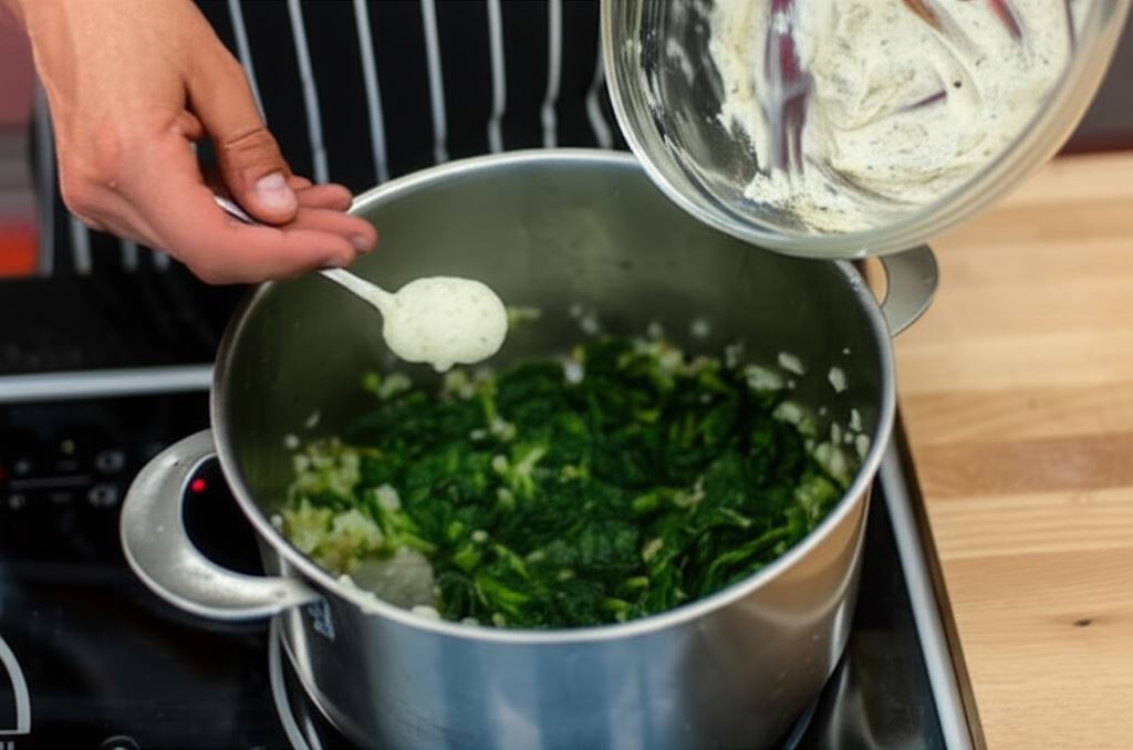 Całość zalej wymieszanym w śmietanie Fixem Knorr i doprowadź do wrzenia. Przestudź szpinak, następnie dodaj pokrojoną w kostkę mozzarellę.
