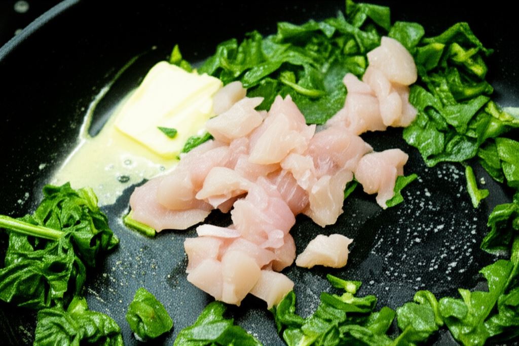 Na rozgrzanym maśle obsmaż pocięte małe filety, dodaj szpinak, lekko ostudź.