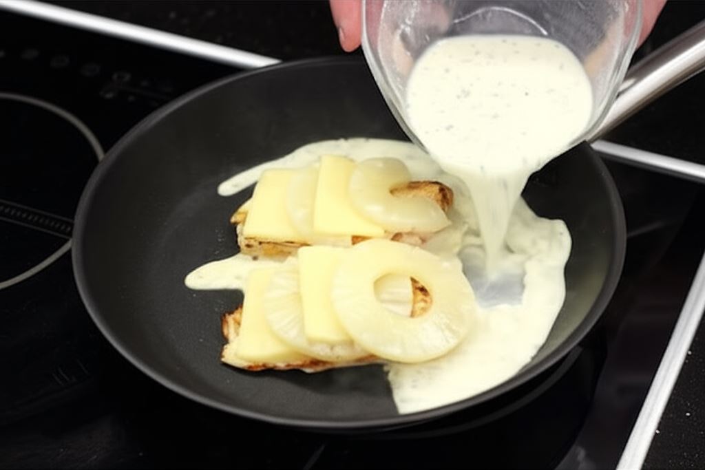 Obsmażaj piersi z dwóch stron, połóż na nich po plastrze sera i ananasa.