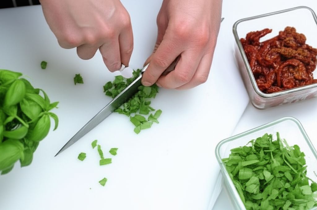 Mozzarellę i pomidory suszone potnij na drobniejsze części. Posiekaj bazylię. Połącz razem wszystkie składniki.