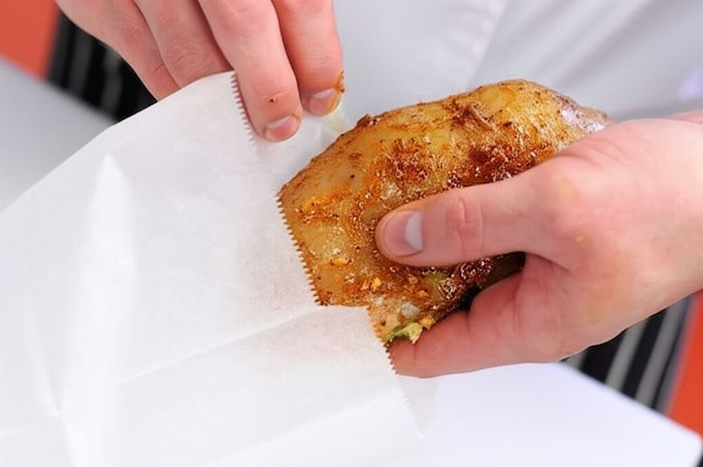 Tuż przed smażeniem rozłóż każdą pierś na płasko i umieść oddzielnie na pergaminie. Zawiń jego końce, a utrzymasz patelnię w czystości.