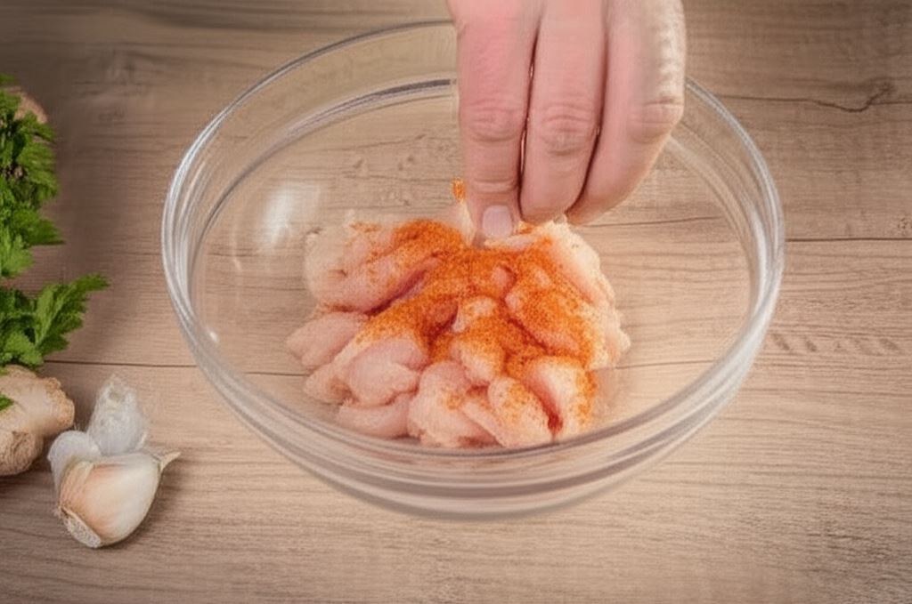 Kurczaka potnij w paski, posyp przyprawą do złotego kurczaka Knorr. Odłóż na bok do zamarynowania na parę godzin.
