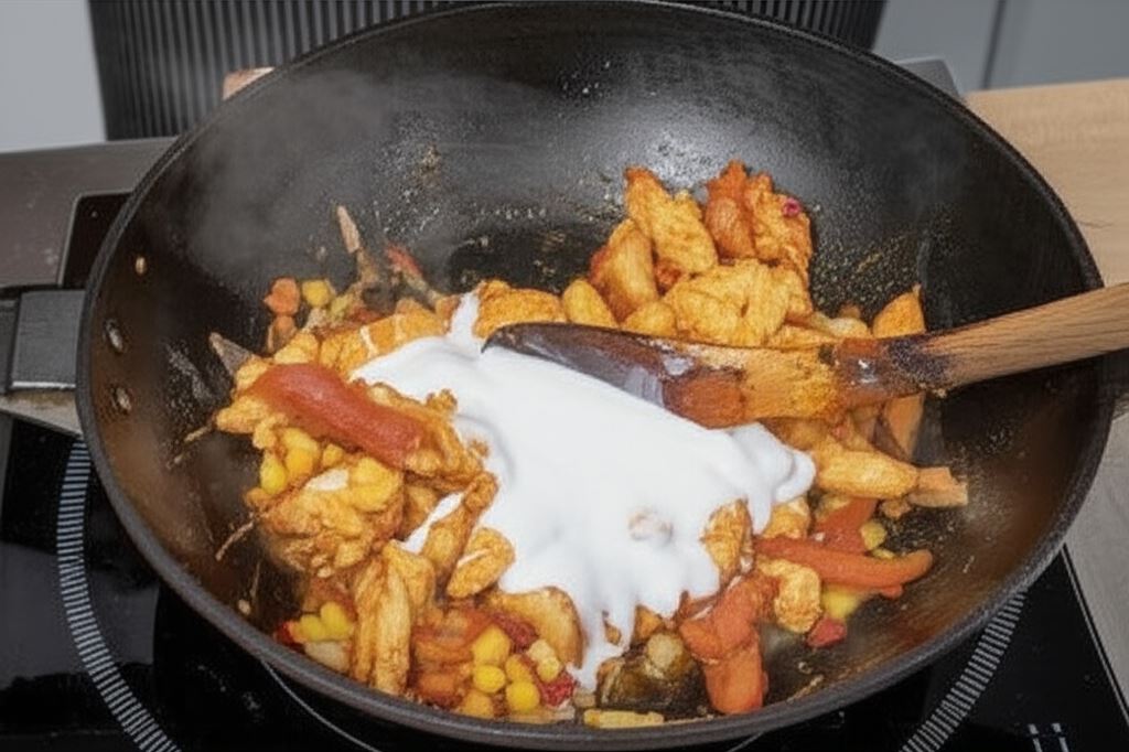Smaż wszystko razem do momentu, gdy ocet prawie całkowicie odparuje, następnie dodaj napój kokosowy i kurczaka. Duś całość przez dwie trzy minuty.