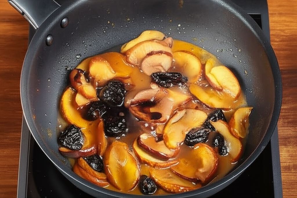 Zdejmij mięso z patelni, umieść owoce z winem. Dodaj jedną szklankę wody i gotuj przez 15 minut.