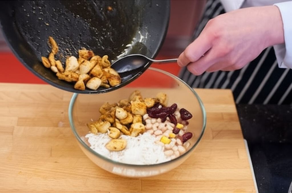 Połącz w misce ugotowany ryż z fasolkami, kukurydzą i mięsem.
