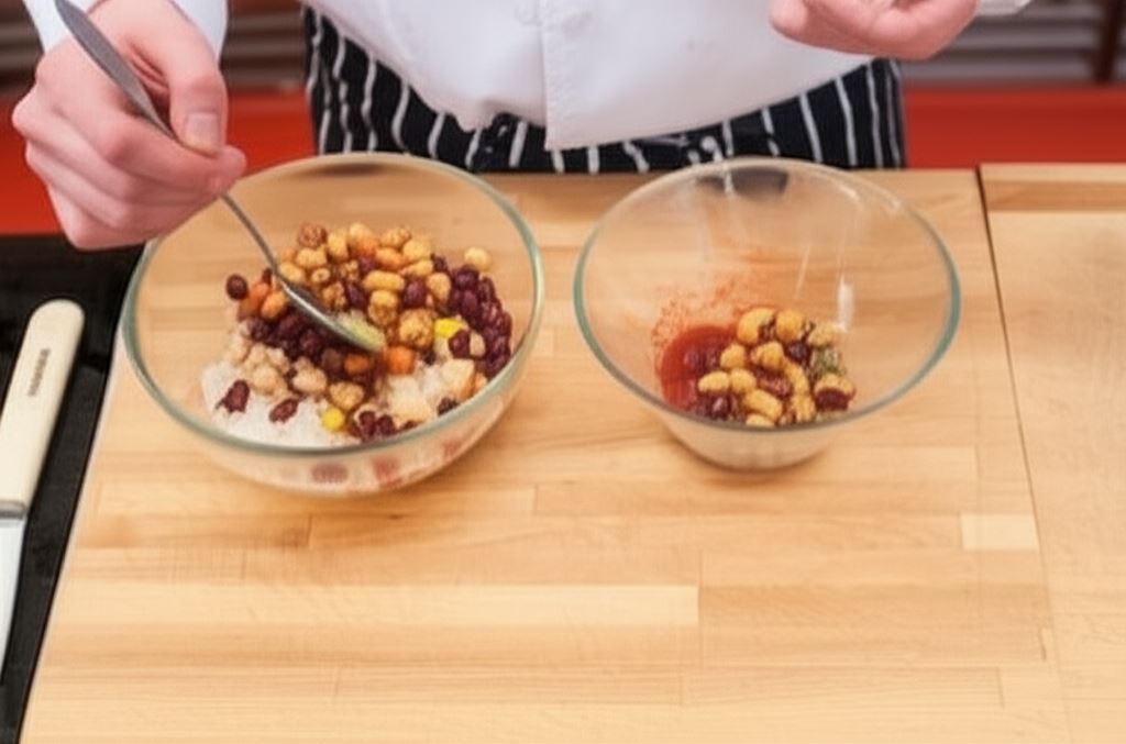 Oprócz standardowych przypraw, dodaj szczyptę chili i oregano, aby wzbogacić smak sałatki. Zamiast podawać ją z ryżem, możesz zaserwować ją z chrupiącymi grzankami, świeżym pieczywem lub zawinąć w placki tortilli. Dla najlepszego efektu smakowego, odstaw gotową sałatkę do lodówki na około godzinę przed podaniem.