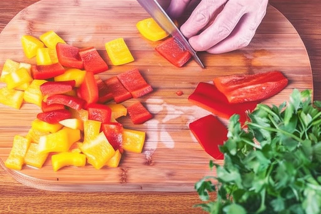 Przepłucz papryki, wydrąż nasiona i pokrój na duże kawałki.
