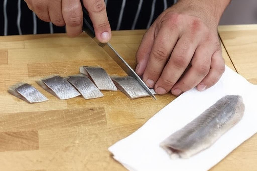 Śledzie osusz na papierowym ręczniku z nadmiaru oleju, a następnie potnij na większe kawałki.