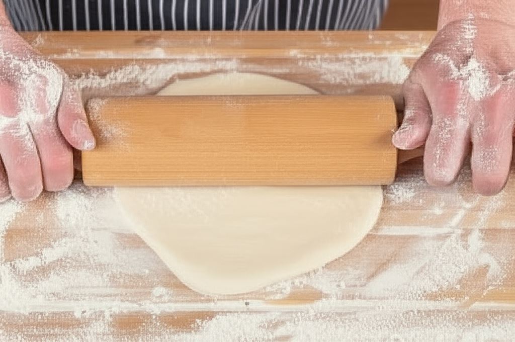 Ciasto rozdziel na dwie porcje, przez moment znów wyrabiaj, po czym rozwałkuj każdą część i umieść je w okrągłej, metalowej formie do tortu lub na blasze do pizzy.