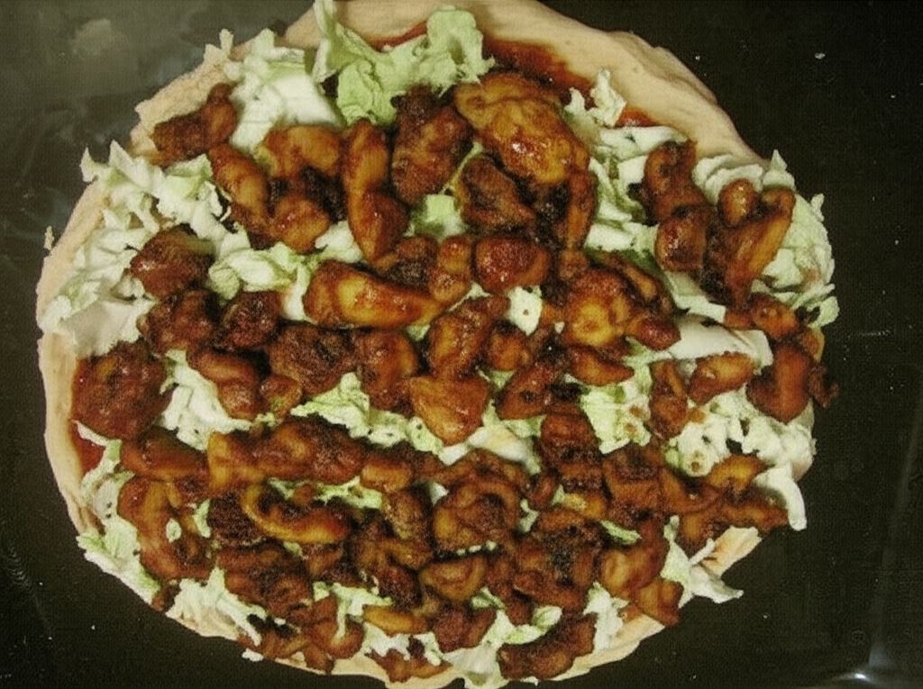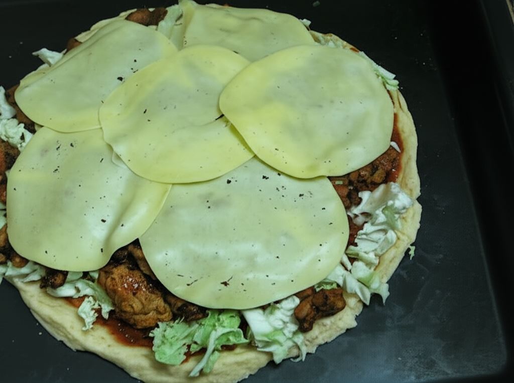 Kiedy ciasto wyrośnie, przełóż je z miski na blachę i przy użyciu wałka uformuj okrągły placek do pizzy ok. 28 cm, delikatnie podnieś brzegi ciasta aby sos nie wyciekł. pokryj ciasto sosem pomidorowym, obsyp posiekaną kapustą pekińską, na górę połóż usmażonego kurczaka o smaku kebabu i przykryj plastrami sera salami. Pizzę umieść w piekarniku rozgrzanym do temp. 200 stopni z termoobiegiem i piecz ok. 15 minut.