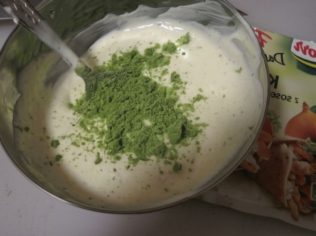 Przygotuj sos czosnkowy do posmarowania pizzy: połącz w miseczce opakowanie sosu dołączonego do Knorr fixu kebab z sosem czosnkowym, wsyp 3 łyżki majonezu i 3 łyżki jogurtu naturalnego, całość wymieszaj przy użyciu łyżki. Kiedy pizza jest gotowa, podziel ją na ćwiartki, ułóż na talerzu i posmaruj sosem czosnkowym.