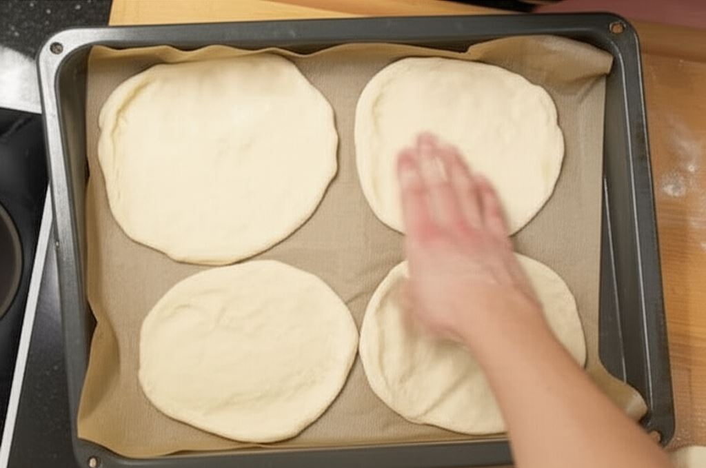 Na blacie stołu lub stolnicy lekko oprószonej mąką rozwałkuj albo rozciągnij ciasto dłonią tworząc okrągły placek. Placek umieść na papierze do pieczenia na odwróconej do góry dnem blasze piekarnika.