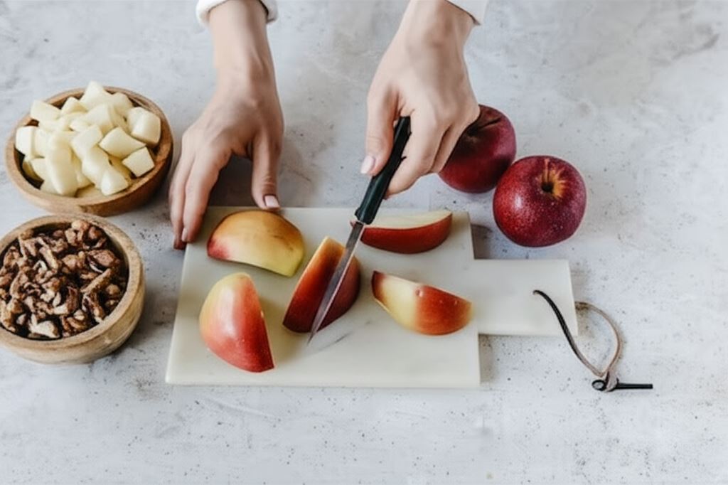 Jabłka myjemy, obieramy i kroimy w kosteczkę. Orzechy siekamy na drobno.