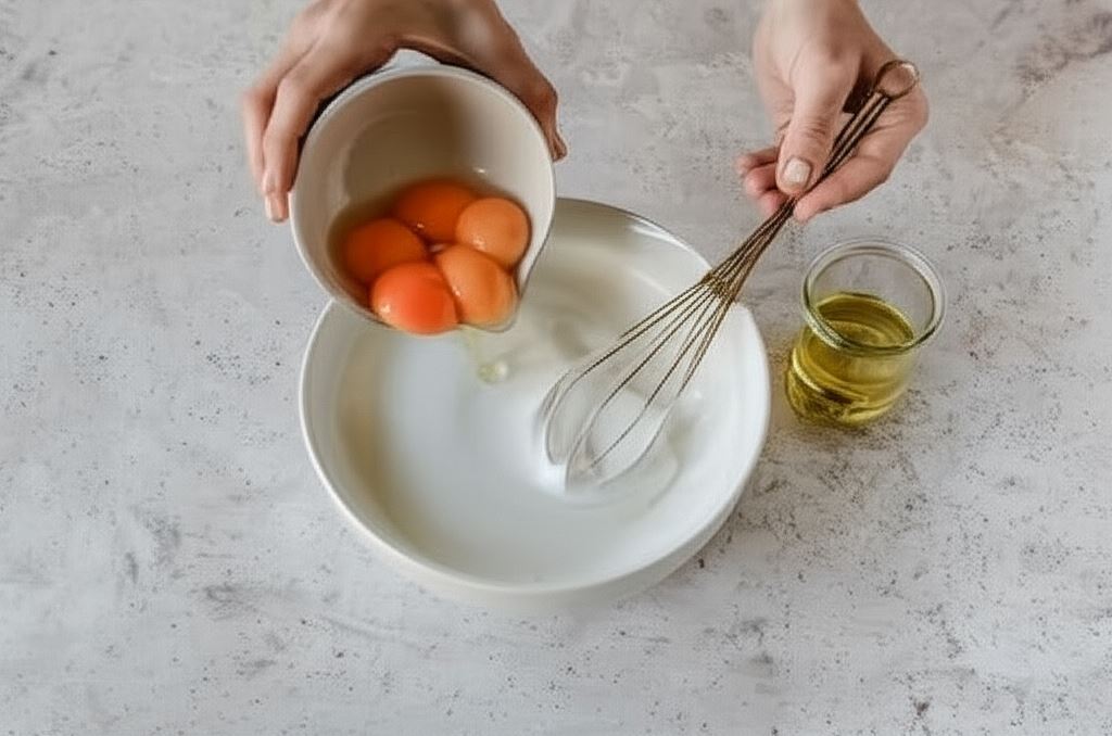 Białka ubijamy na sztywno. W trakcie ubijania dodajemy stopniowo cukier po łyżce, aż masa stanie się sztywna i błyszcząca. Potem dokładamy żółtka, a po chwili dolewamy olej.