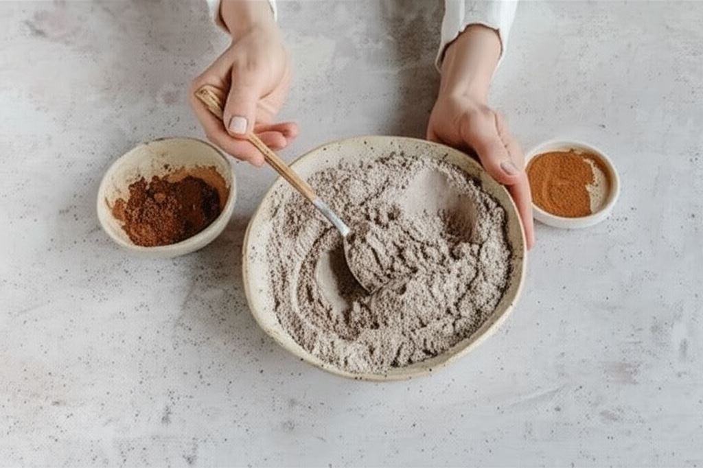 Mąkę przesiewamy z proszkiem do pieczenia i sodą do miski. Wsypujemy kakao oraz cynamon. Wszystko mieszamy.