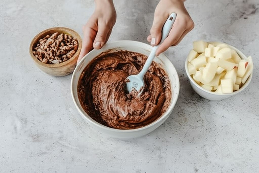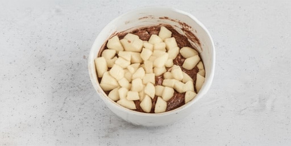 Orzechy i jabłka wsypujemy do miski i łączymy z ciastem używając łopatki.