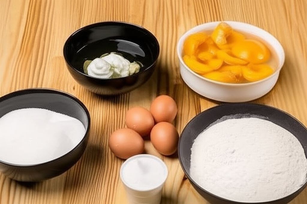 Rozpocznij od przygotowania ciasta. Brzoskwinie z konserwy potnij na ćwiartki. Jajko ubij z cukrem na białą masę, dodaj jogurt i olej.
