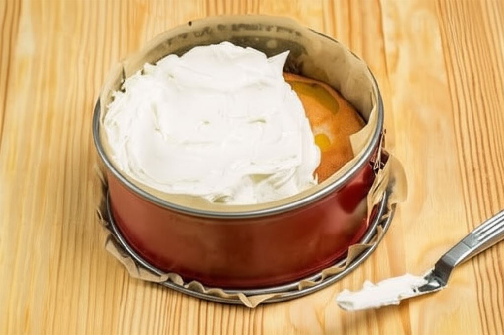 Potem wsyp przesianą mąkę z proszkiem do pieczenia. Ostrożnie wymieszaj delikatną łyżką i przelej na przygotowaną tortownicę o średnicy około 20 cm.