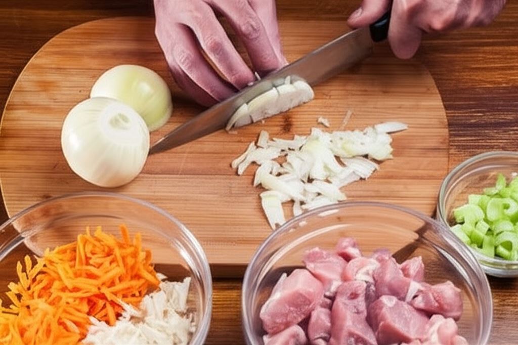 Mięso potnij w kostkę. Warzywa obierz i zetrzyj na tarce, selera pokrój na plasterki, cebulę drobno posiekaj.