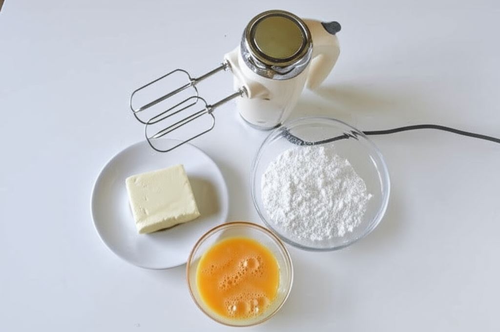 Masło ucieramy z cukrem pudrem. Żółtka oddzielamy od białek. Żółtka stopniowo wprowadzamy do utartej masy z masła i cukru, również ucierając.