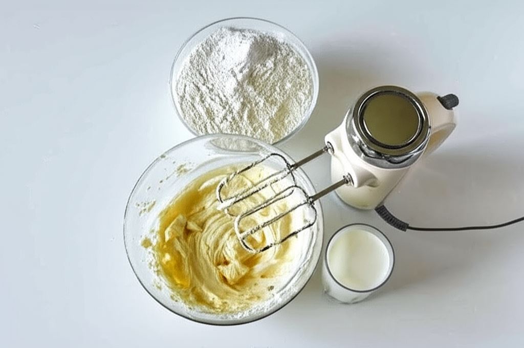 Do utartego masła z cukrem i jajkami wsypujemy na przemian łyżkę mąki, łyżkę mleka oraz proszek do pieczenia.