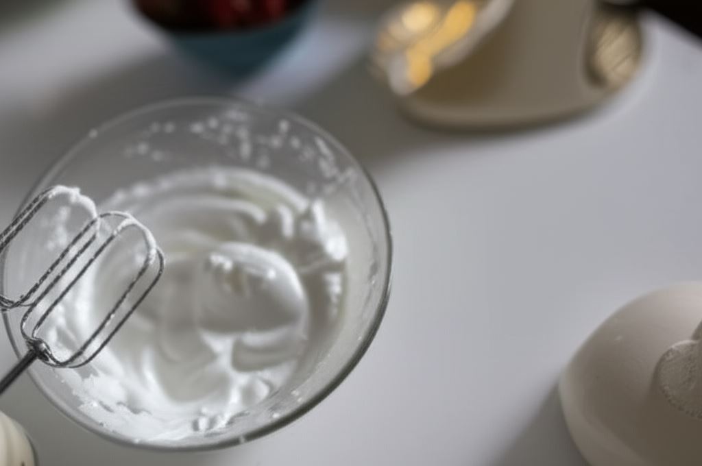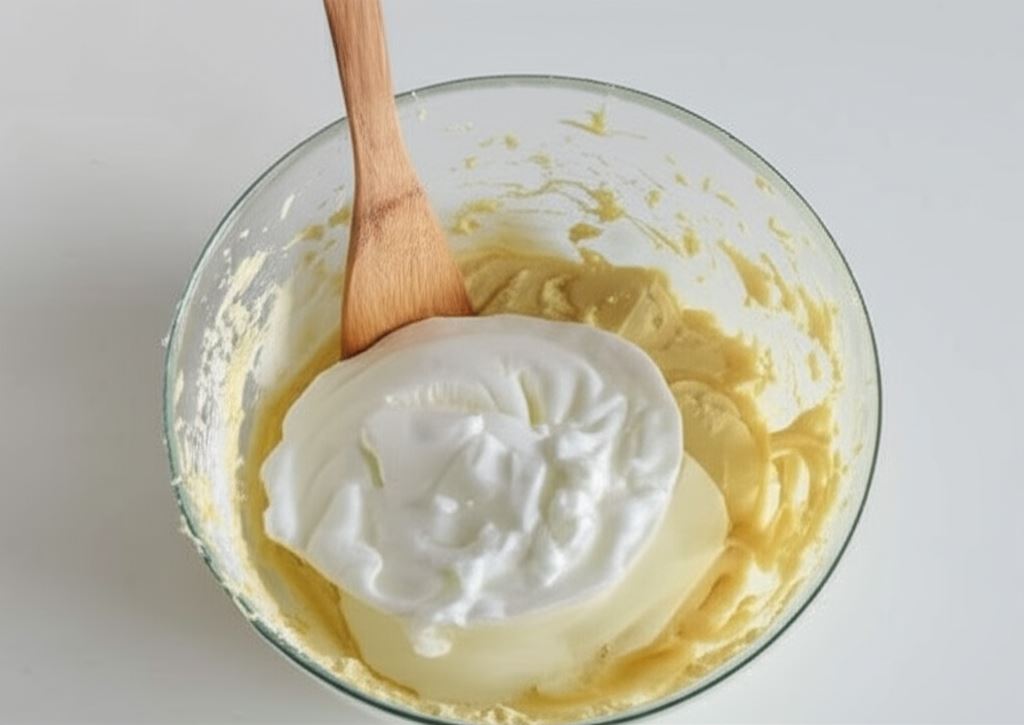 Białka ostrożnie wkładamy do utartej mieszanki.