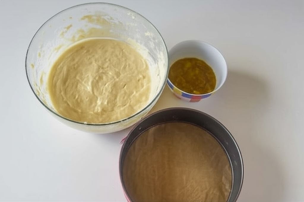 Formę wykładamy papierem do pieczenia. Brzegi smarujemy niewielką ilością masła i posypujemy mąką. Wylewamy masę. Rozkładamy karmelizowany rabarbar. Ciasto wstawiamy do zimnego piekarnika. Piekarnik rozgrzewamy do 180 stopni (termoobieg). Ciasto pieczemy około 45 minut do momentu suchego patyczka.