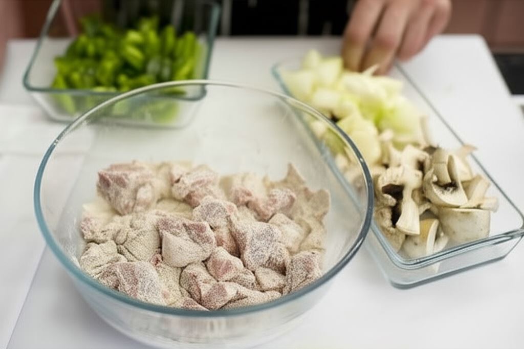 Mięso przepłucz i potnij w dużą kostkę. Mąkę połącz ze sproszkowaną papryką, po czym obtocz w niej kawałki mięsa. Umyte pieczarki potnij w ćwiartki, papryki oraz cebule w dużą kostkę. Czosnek zmiażdż.