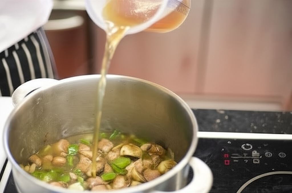 W tym samym garnku podgrzej ponownie trochę oliwy i obsmaż posypane mąką mięso. Dodaj podsmażone uprzednio warzywa i pieczarki, potem wlej wino i zmniejsz jego objętość. Uzupełnij wszystko bulionem, doprowadź do wrzenia i gotuj aż mięso stanie się miękkie.