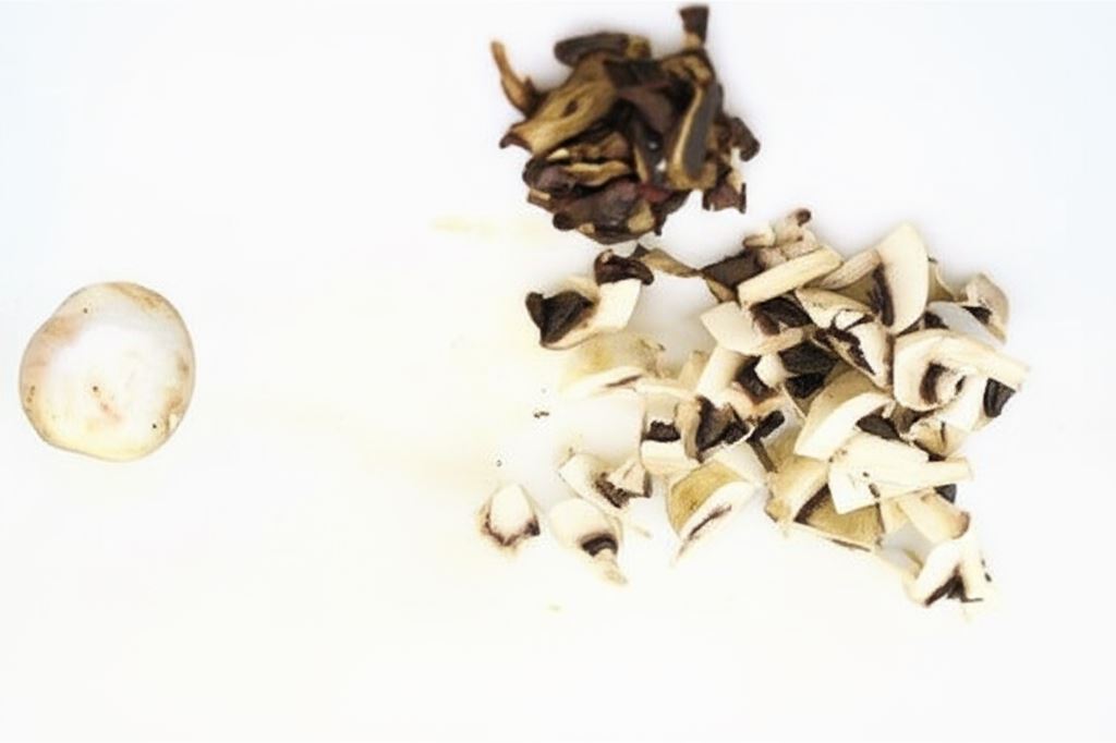 Suszone grzyby namocz w wodzie, potem odcedź i potnij w cienkie paski – wodę z moczenia zachowaj.