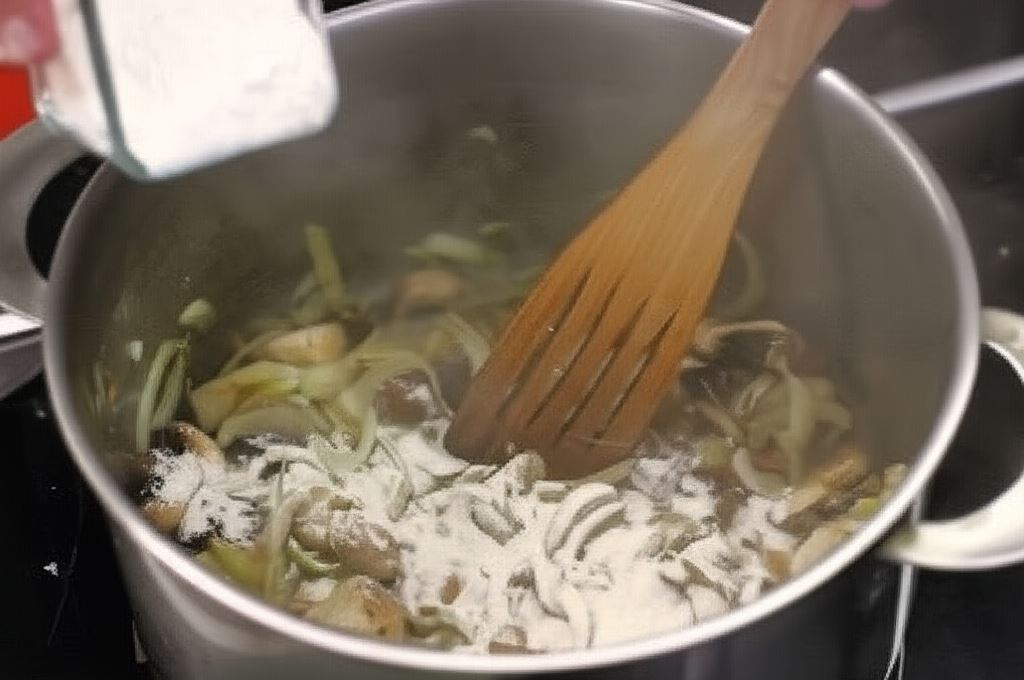 Potem wsyp do garnka pokrojone: pieczarki, prawdziwki i podgrzybki – wszystko posyp mąką, zamieszaj i smaż jeszcze moment. Po chwili dolej do grzybów wino i odparuj.