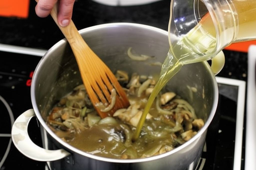 Kiedy wino wyparuje, dodaj do garnka bulion i wywar z namoczonych grzybów, po czym zagotuj. Gotuj przez 10 minut na małym ogniu. Na końcu gotowania dodaj śmietanę i przypraw startym majerankiem, pieprzem oraz w razie potrzeby – solą.
