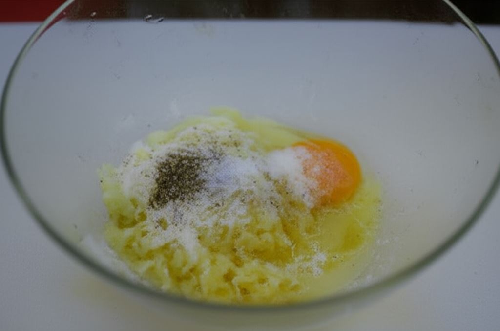 Ziemniaki i cebule obierz i zeszklij na tarce o małych oczkach, wyciśnij część płynu. Dodaj jajka i mąkę. Przypraw solą i pieprzem, zamieszaj.