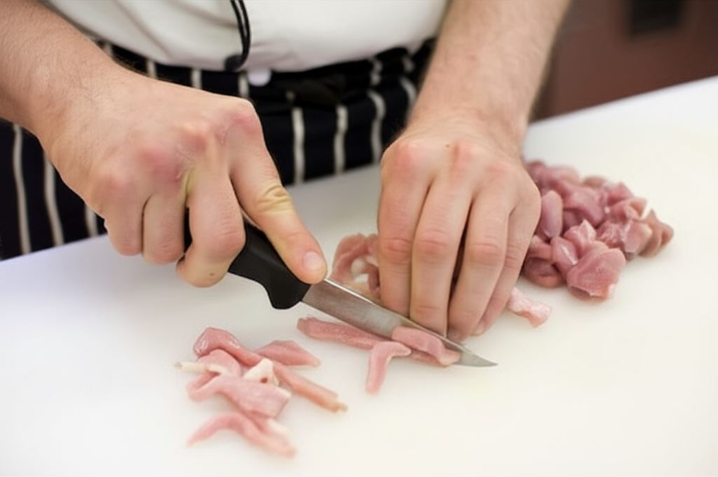 Mięso przeznaczone na gulasz pokrój w kostkę, natomiast boczek w słupki.