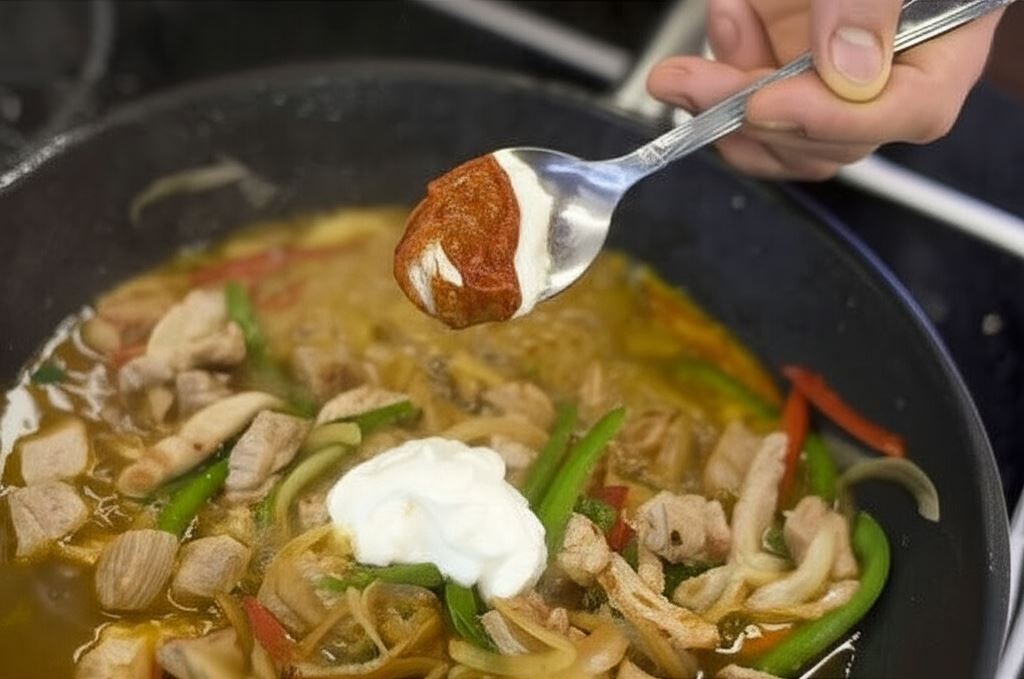Wymieszaj ze śmietaną połączoną z mąką, wprowadź pastę paprykową. Duś przez 10 minut, dopraw solą i pieprzem. Gulasz nakładaj na placki, które potem zginaj na pół.