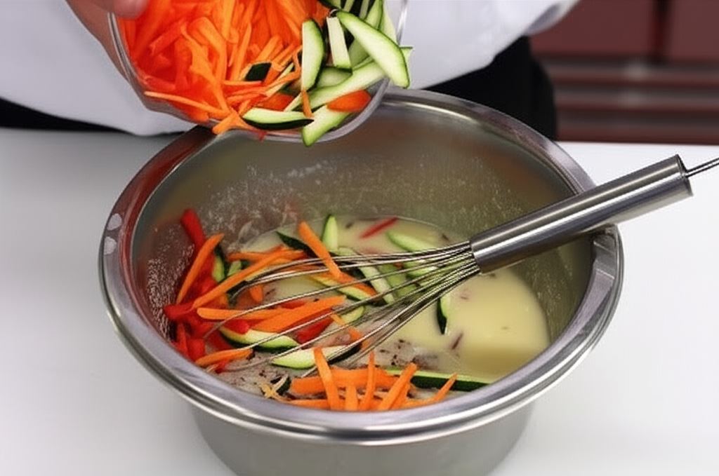 Przygotuj Fix Chrupiące placki ziemniaczane Knorr zgodnie z instrukcją na opakowaniu, łącząc go z jajkiem i wodą. Potem odstaw na 10 minut, aby zgęstniał. W międzyczasie pokrój cukinię, marchewkę i czerwoną paprykę w cienkie paski julienne (albo po prostu zetrzyj na tarce). Cebulę posiekaj w drobną kostkę. Warzywa wprowadź do ciasta.