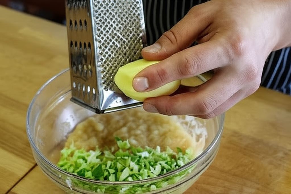 Ziemniaki zetrzyj na tarce z dużymi oczkami i razem z kapustą umieść w misce.