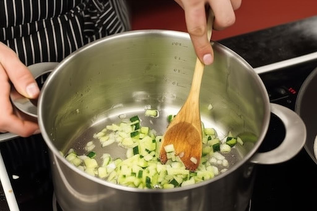 Cebulę i cukinię pokrój, a następnie przesmaż w garnku na rozgrzanym tłuszczu.