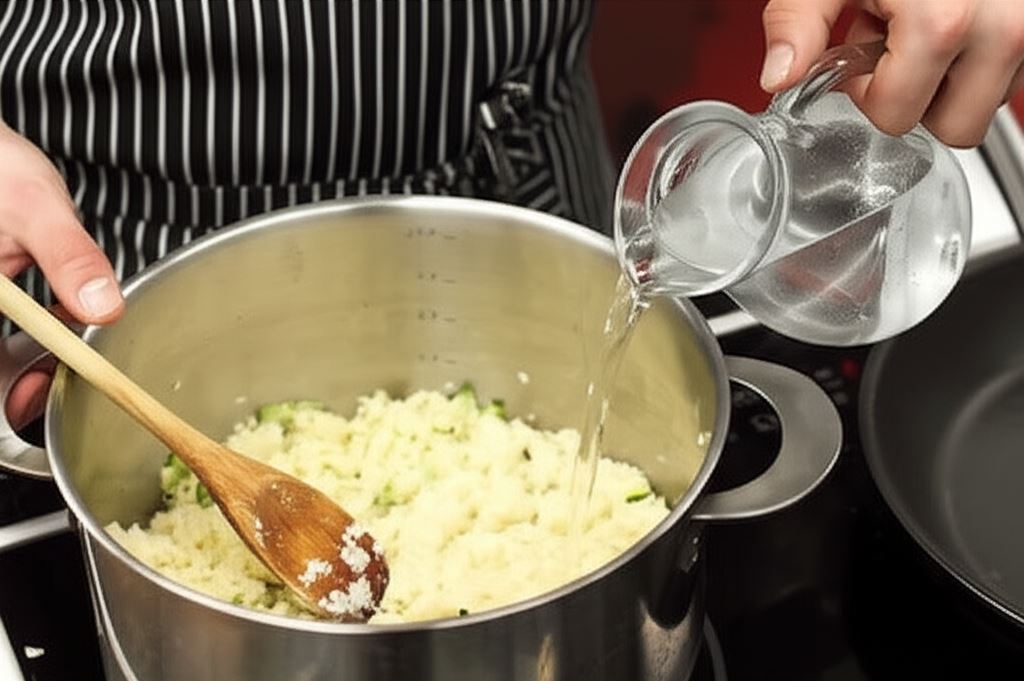 Wsyp kaszę i połącz z warzywami. Następnie zalej 600 ml gorącej wody. Nakryj garnek i odstaw na 10 minut (nie gotuj). Poczekaj, aż kasza nieco ostygnie.